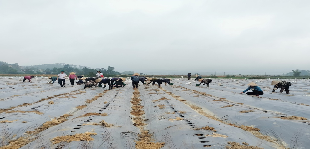 Người dân Thôn 1- Văn Giang xã Mai Hoa đang tập trung xuống giống Dưa leo của Công ty giống Tài Lộc (TL686)