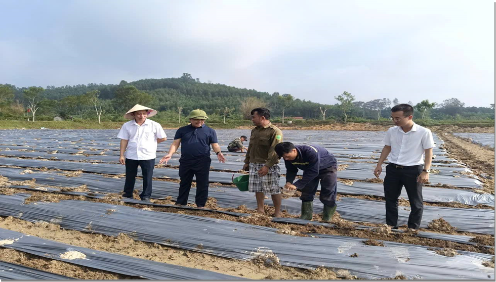 Đ/c Lê Thanh Nghị- Bí thư Đảng uỷ, Chủ tịch HĐND xã; Đ/c Phạm Ngọc Tạo- Phó Bí thư Đảng uỷ, Chủ tịch UBND xã kiểm tra và động viên các hộ xuống giống tại Thôn 2- Bồng Giang