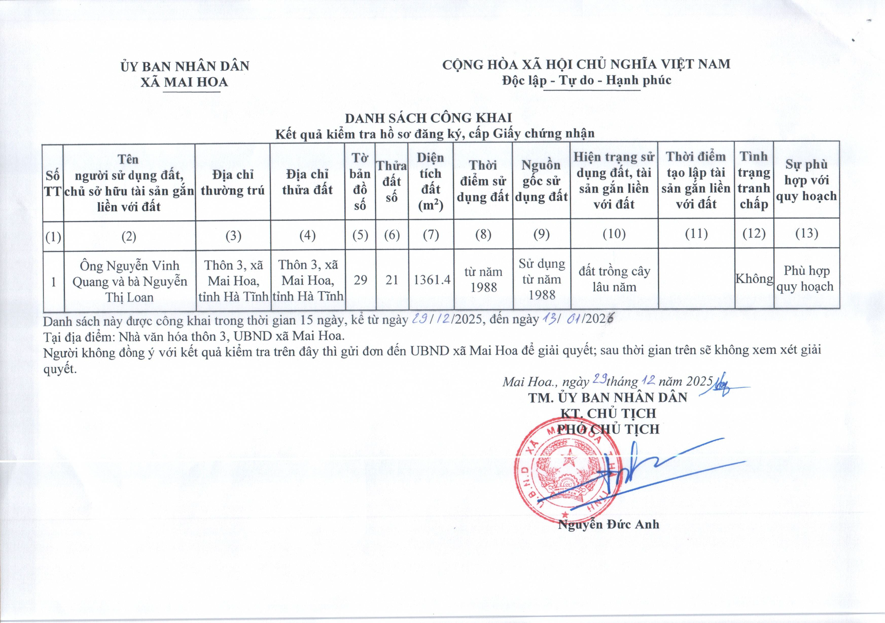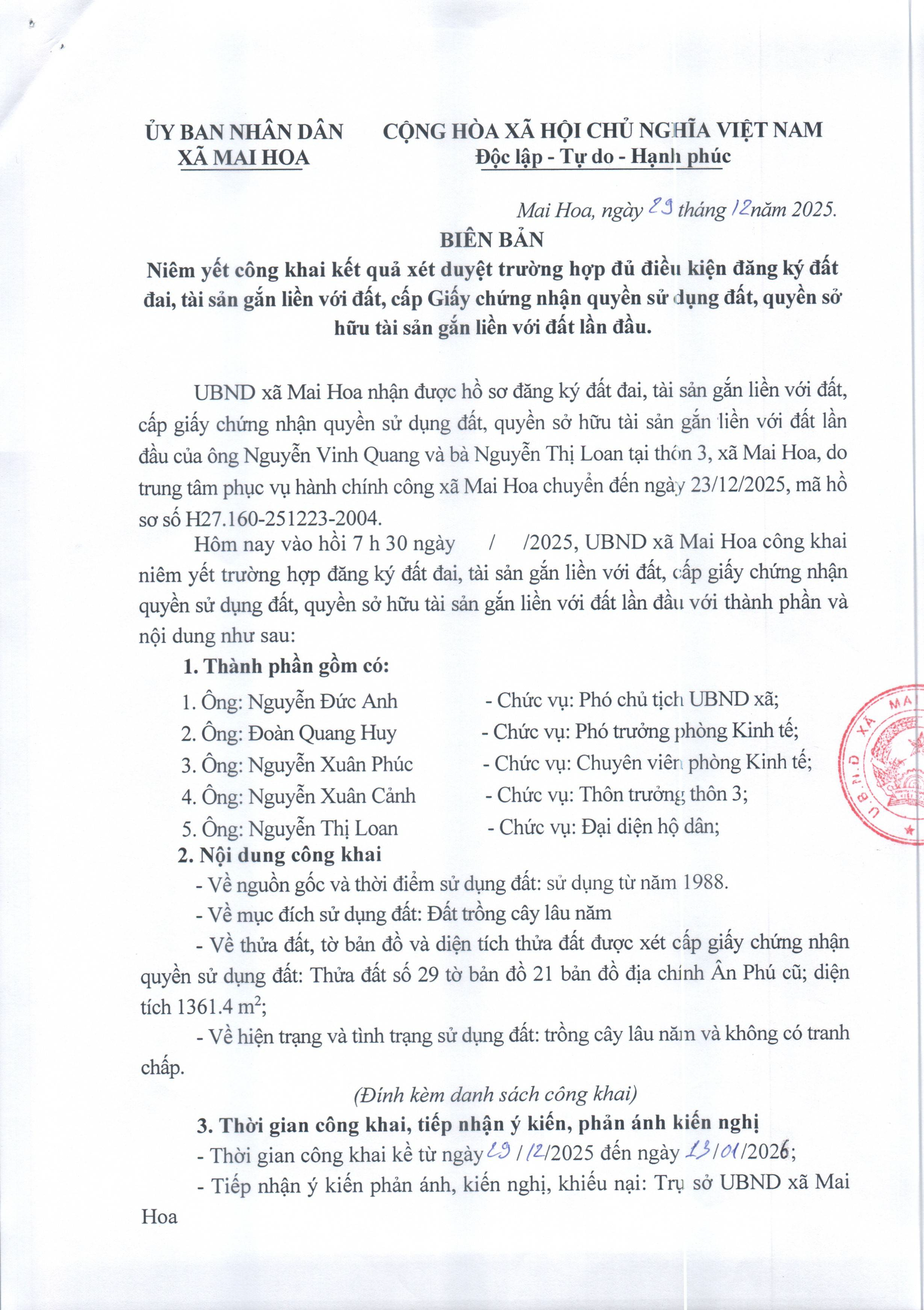 Biên bản niêm yết công khai kết quả xét duyệt trường hợp đủ điều kiện đăng ký đất đai, tài sản gắn liền với đất, cấp Giấy chứng nhận quyền sử dụng đất, quyền sở hữu tài sản gắn liền với đất lần đầu