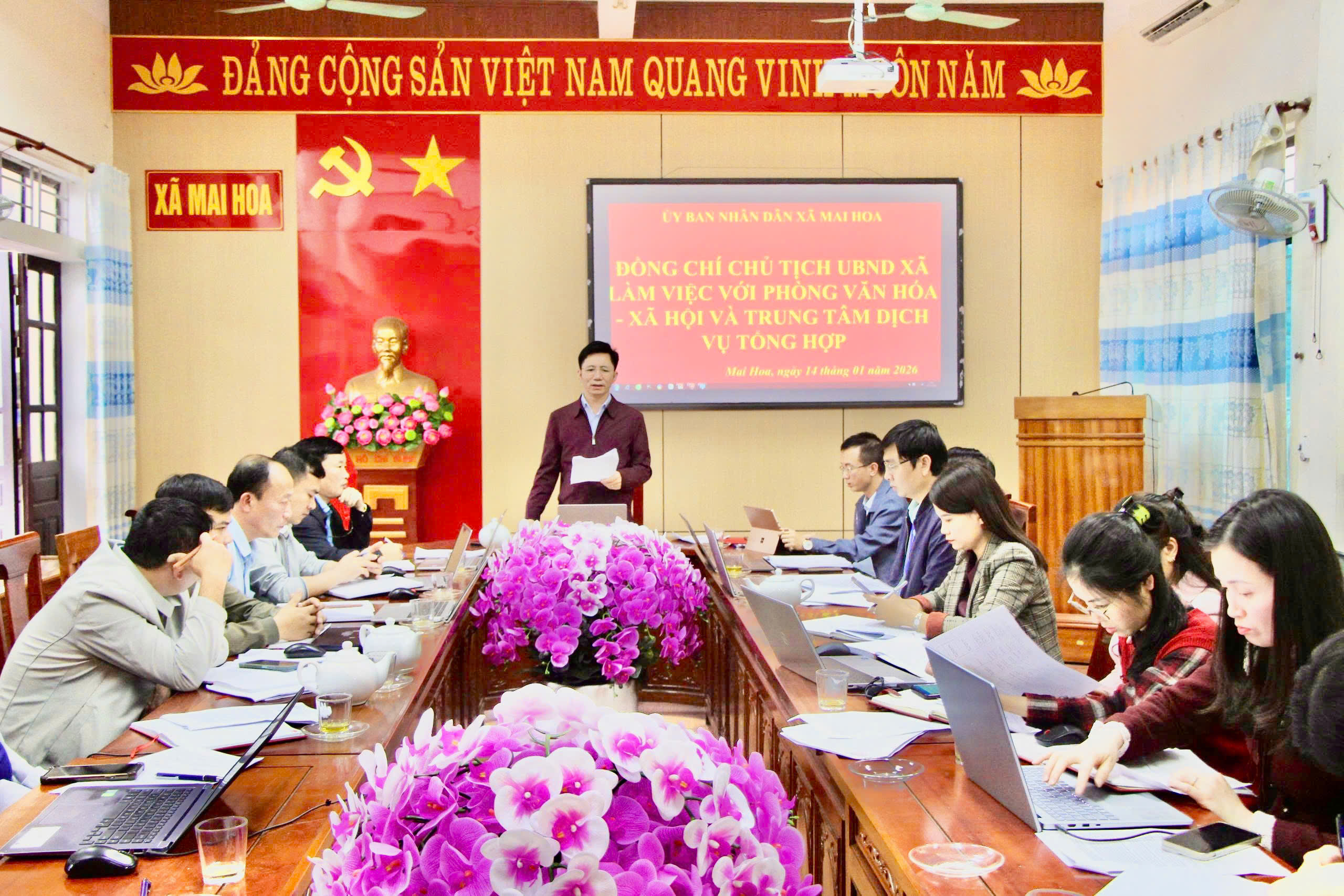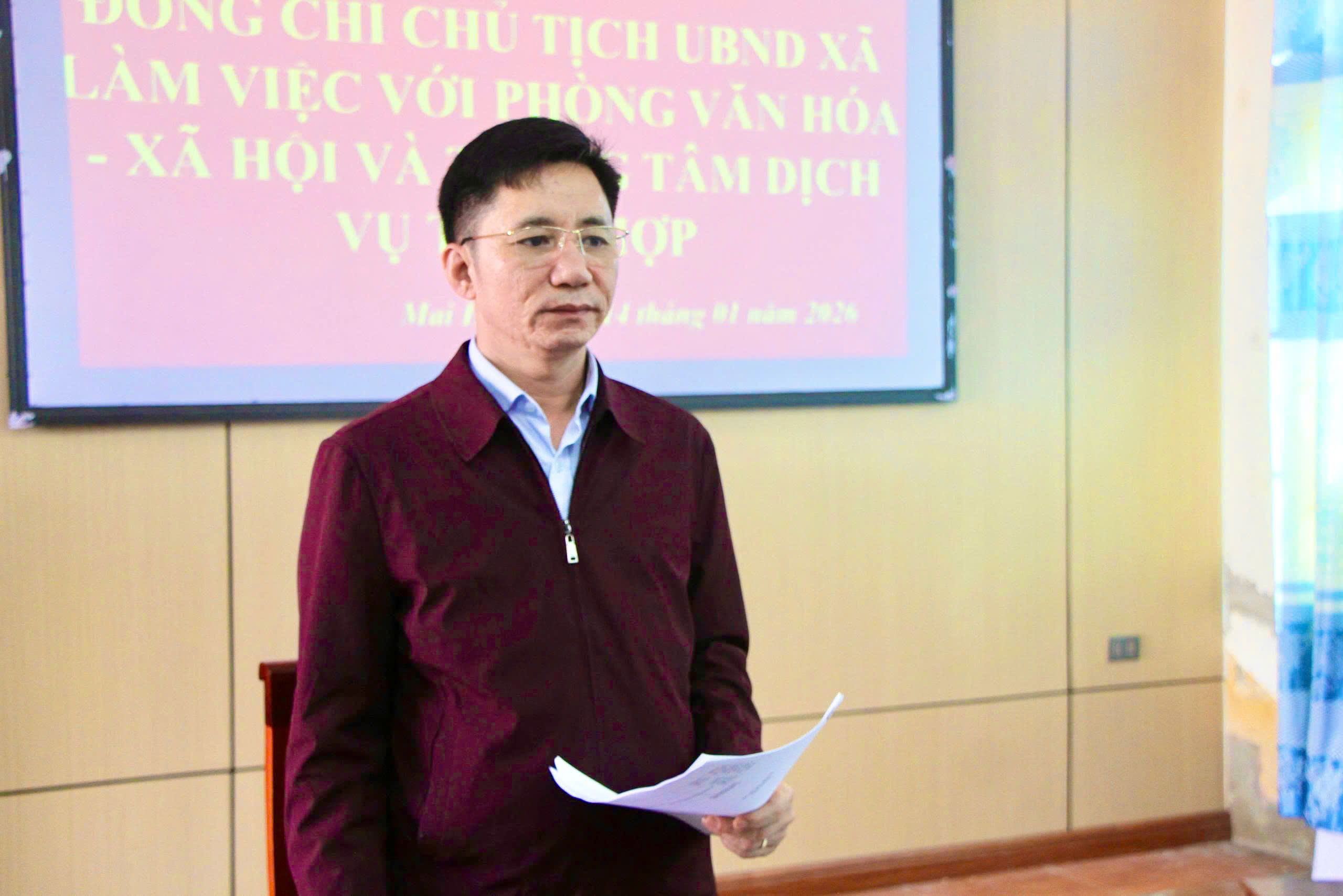 Năm 2026 xác định là năm tăng tốc, đột phá do đó yêu cầu Phòng VH-XH, Trung tâm DVTH cần xây dựng giải pháp, kế hoạch và phân công nhiệm vụ cụ thể, có kiểm tra, đánh giá kết quả thực hiện.Tập trung cải cách hành chính, thi đua khen thưởng, thực hiện tốt công tác quản lý theo chức năng nhiệm vụ. Đẩy mạnh phong trào văn hoá, văn nghệ, thể dục thể thao nâng cao đời sống vật chất tinh thần cho nhân dân, phát triển du lịch tâm linh, du lịch cộng đồng, tuyên truyền trực quan, thông tin, truyền thông. Mỗi cán bộ được phân công phần việc cần tăng cường nghiên cứu, phối hợp để thực hiện tốt hơn. Những kiến nghị đề xuất, nhất là việc đầu tư mua sắm thiết bị phục vụ làm việc UBND xã sẻ quan tâm xem xét trên cơ sở ưu tiên thiết bị cần thiết.