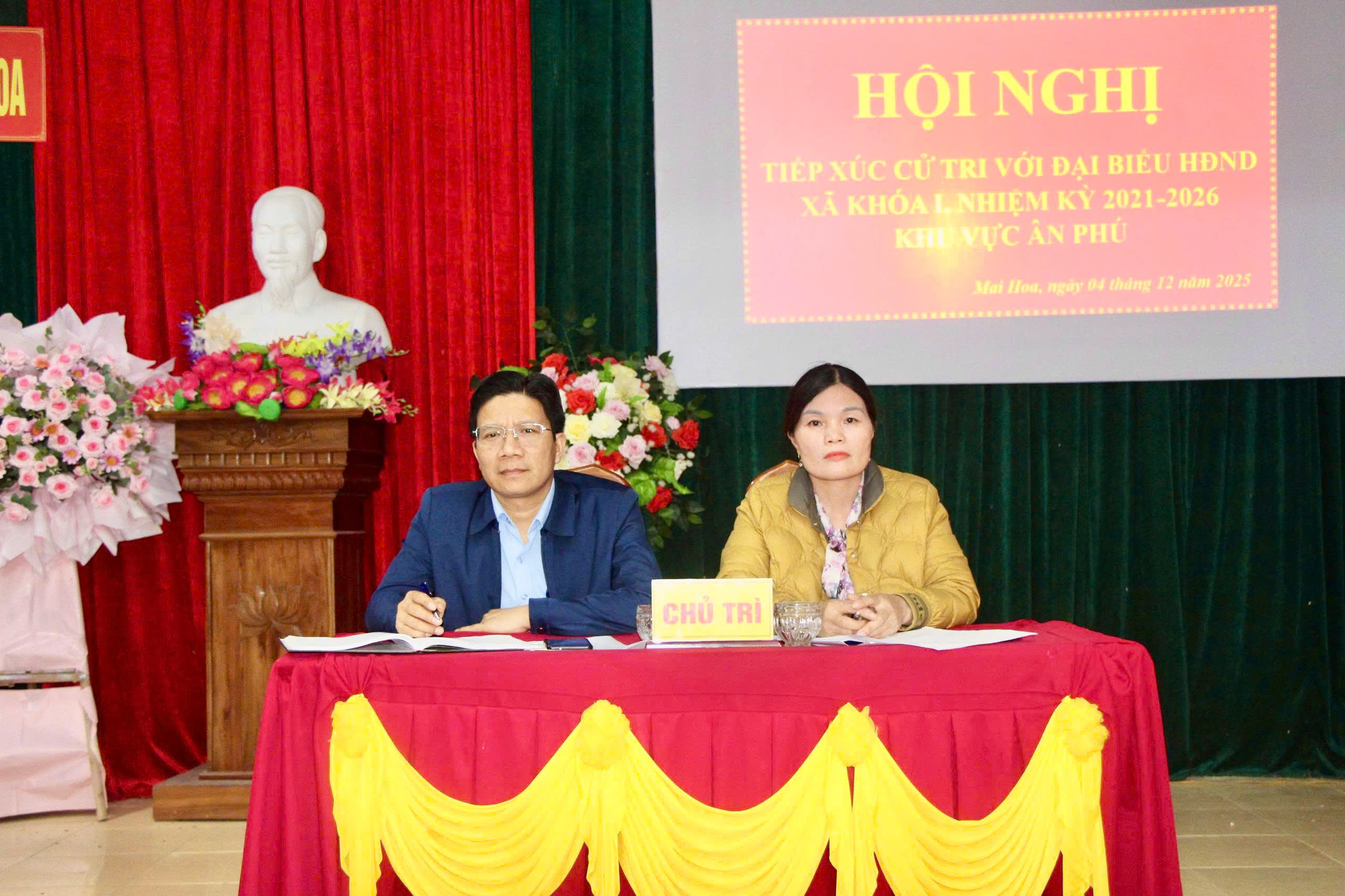 Đ/c Phạm Duy Đạt, Phó chủ tịch HĐND xã, Đ/c Phùng Thị Chiều, Phó chủ tịch UBMTTQ xã Mai Hoa chủ trì buổi tiếp xúc.