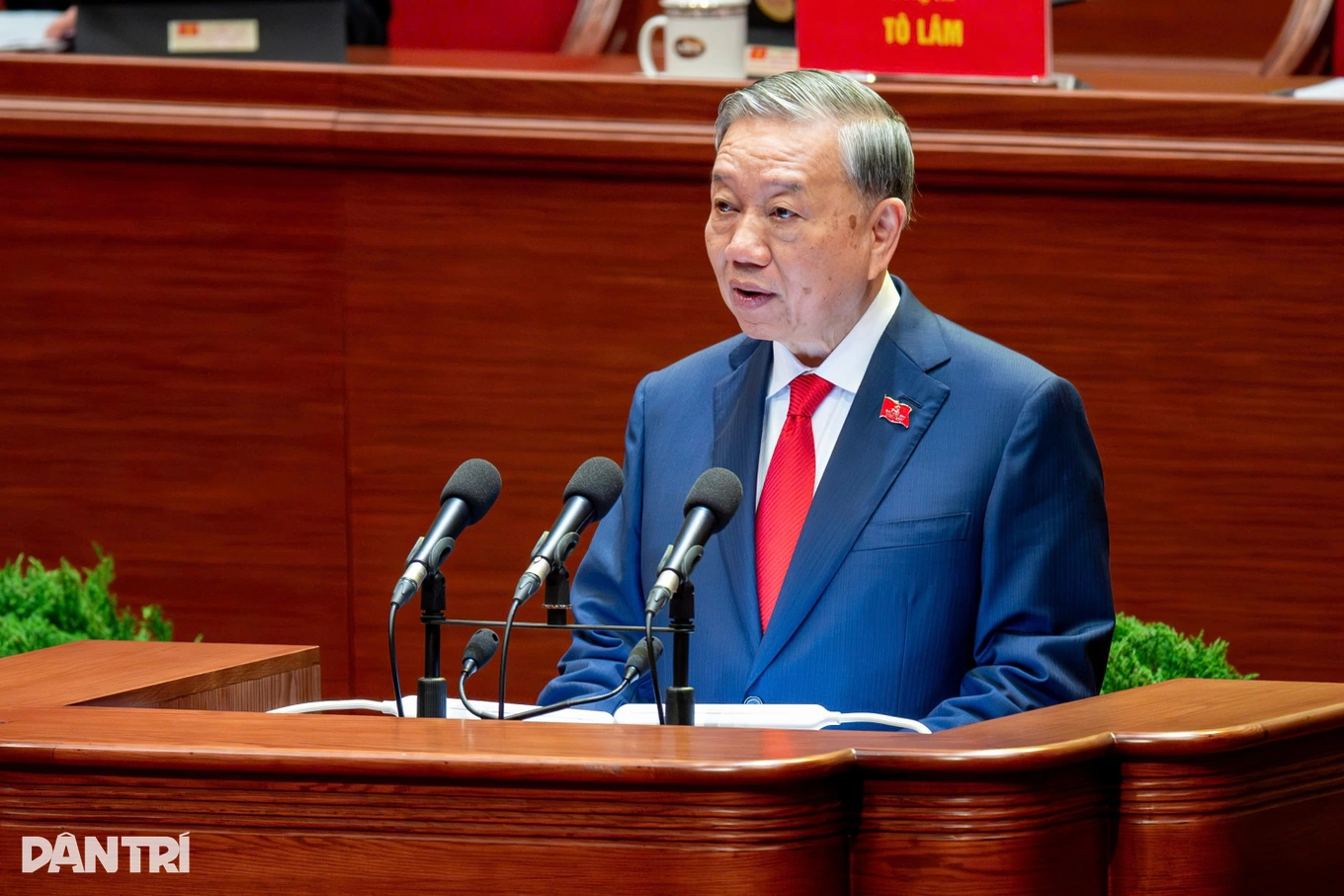 Tổng Bí thư Tô Lâm trình bày Báo cáo của Ban Chấp hành Trung ương Đảng khóa XIII về các văn kiện trình Đại hội XIV của Đảng (Ảnh: Tiến Tuấn).