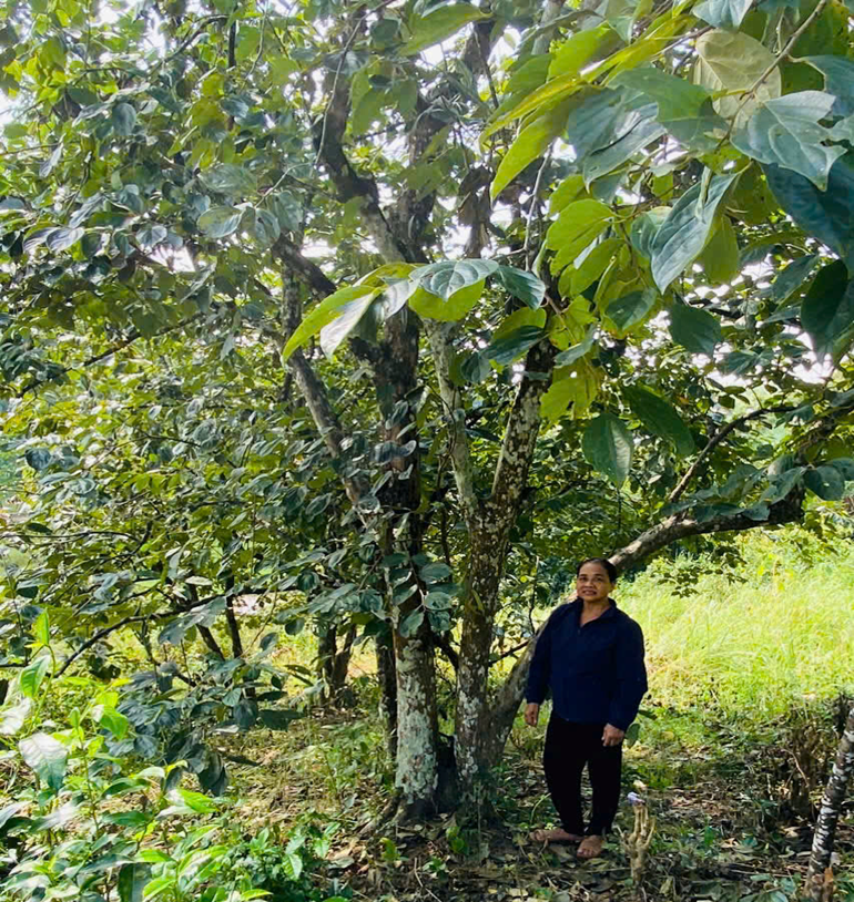 Bà Nguyễn Thị Khương bên gốc Hồng cổ thụ của gia đình