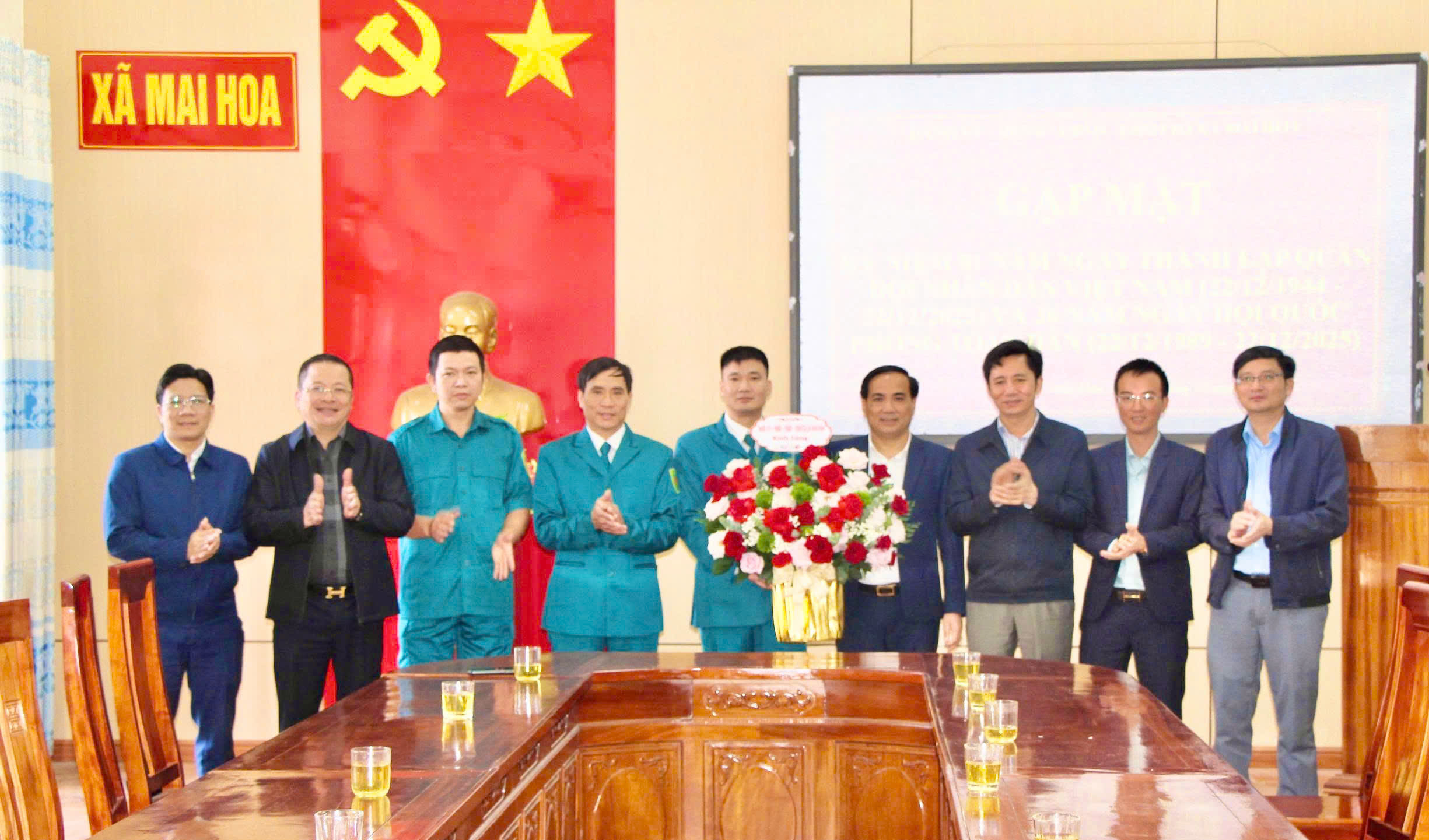 Đồng chí Lê Thanh Nghị, Bí thư Đảng uỷ - Chủ tịch HĐND xã và Phạm Ngọc Tạo, Chủ tịch UBND xã Mai Hoa tặng hoa cùng tặng hoa chúc mừng Ban Chỉ huy quân sự xã