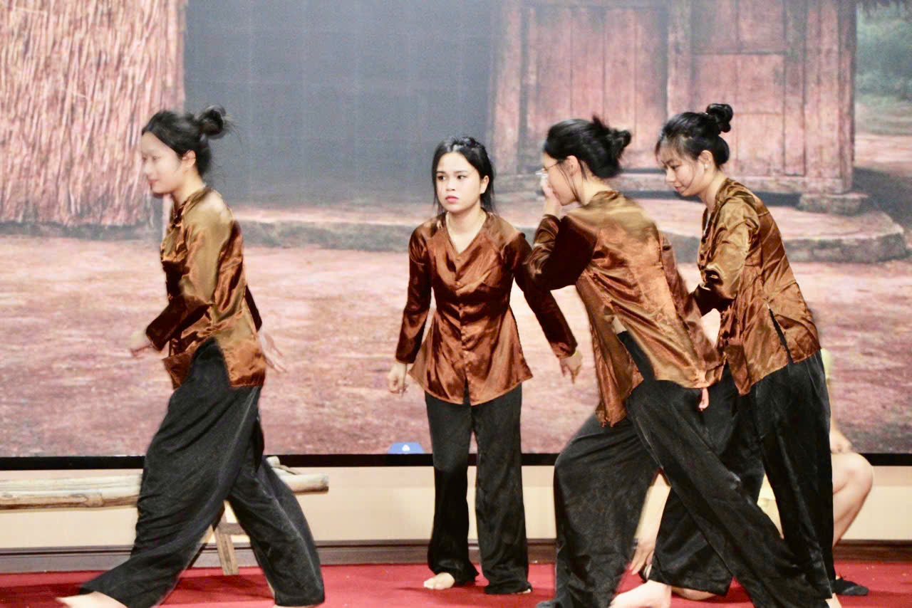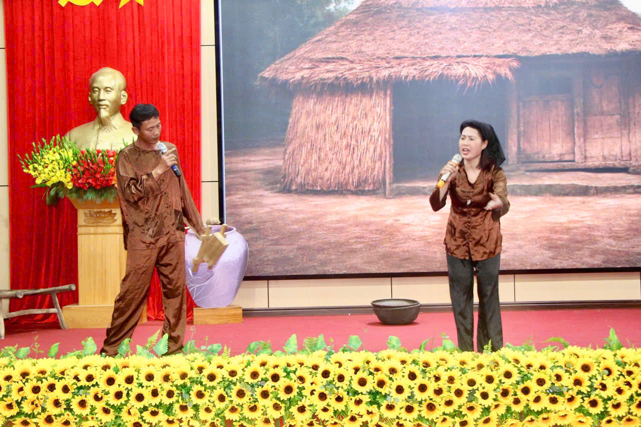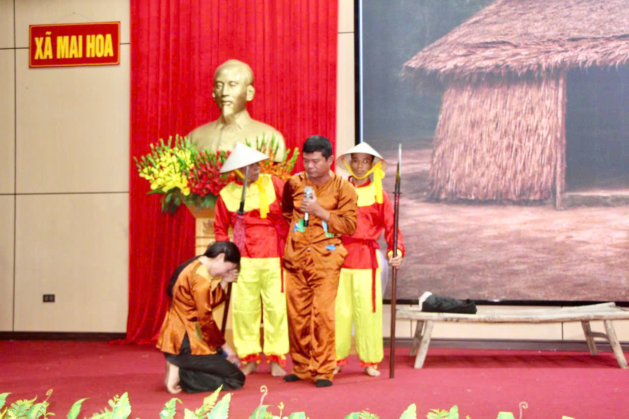 Lãnh đạo xã Mai Hoa xem và duyệt kịch " Ánh lửa Mai Hoa" trước khi công diễn