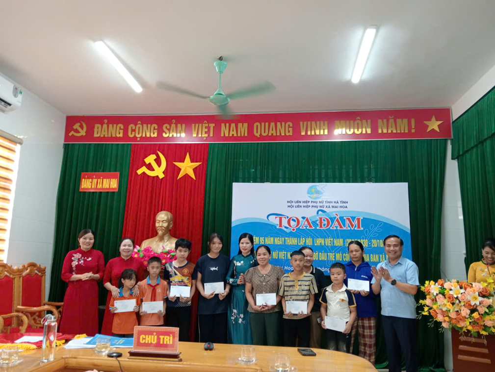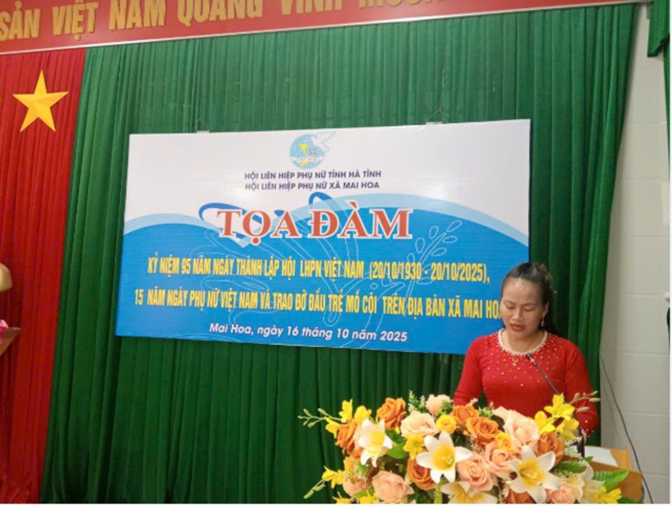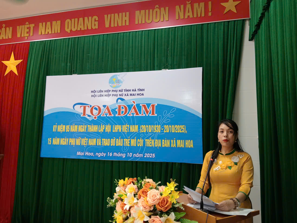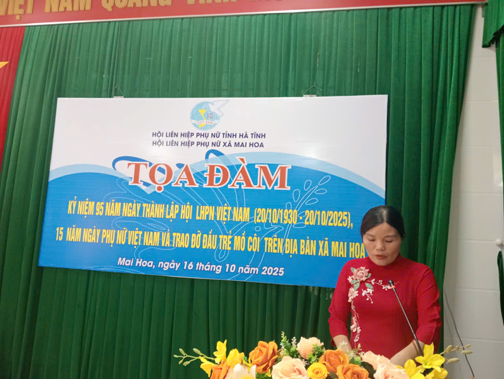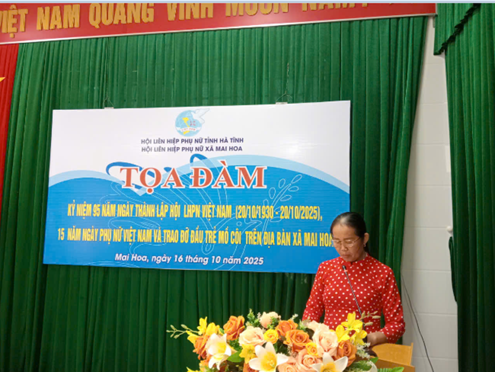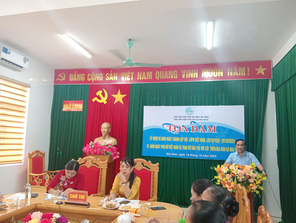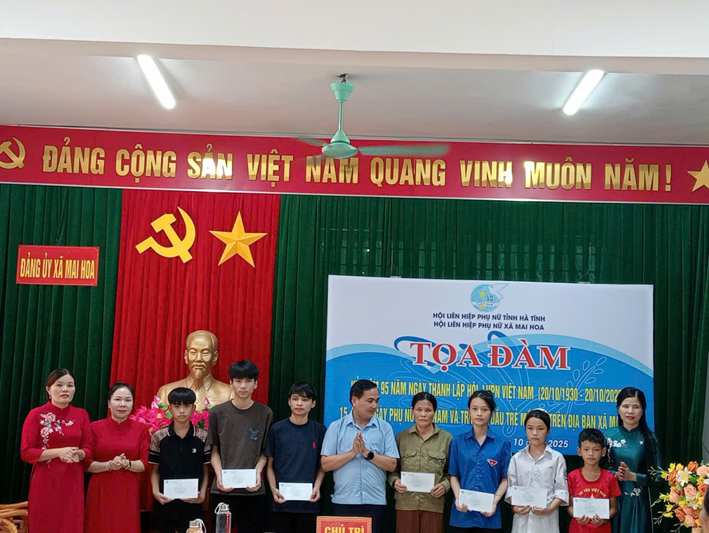 Nhân kỷ niệm 95 năm Ngày thành lập Hội LHPN Việt Nam (20/10/1930 – 20/10/2025) và 15 năm Ngày Phụ nữ Việt Nam (20/10/2010 – 20/10/2025), chiều 15/10, Hội Liên hiệp Phụ nữ xã Mai Hoa, Hà Tĩnh tổ chức tọa đàm, gặp mặt và trao đỡ đầu trẻ em mồ côi trên địa bàn xã.