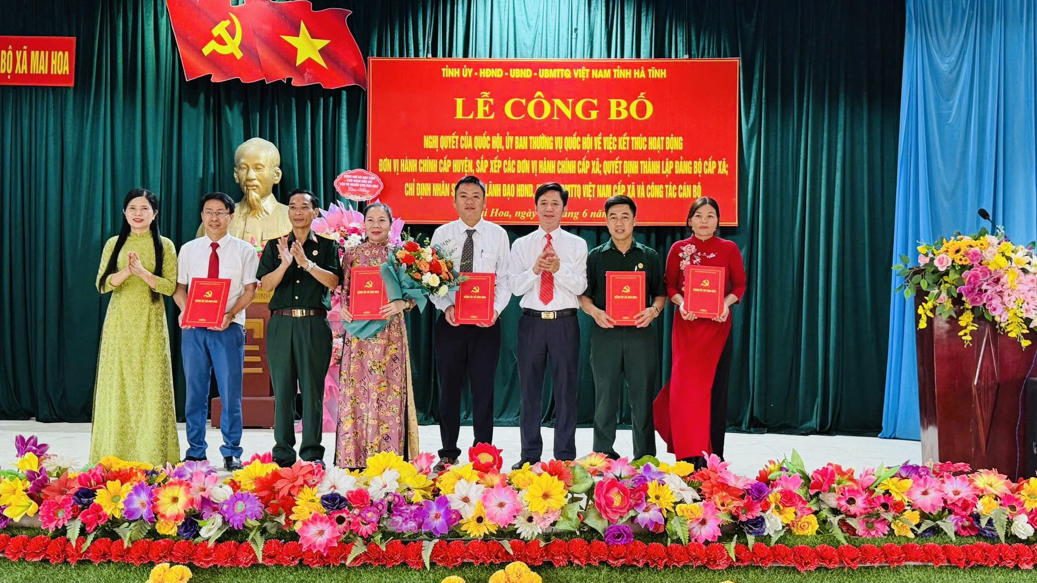 Bà Trần Thị Hồng Vững ( tưhs 4 bên trái sang) nhận quyết định Chủ tịch UBMTTQ tỉnh tại lễ công bố thành lập xã Mai Hoa