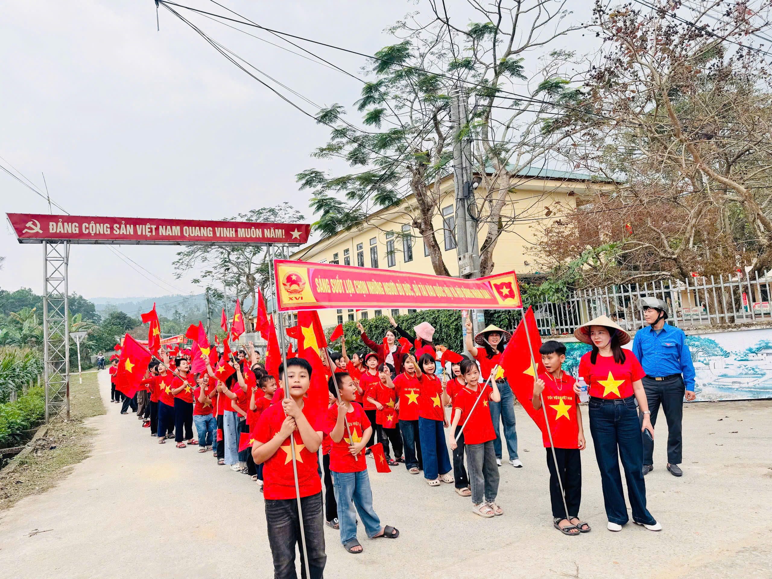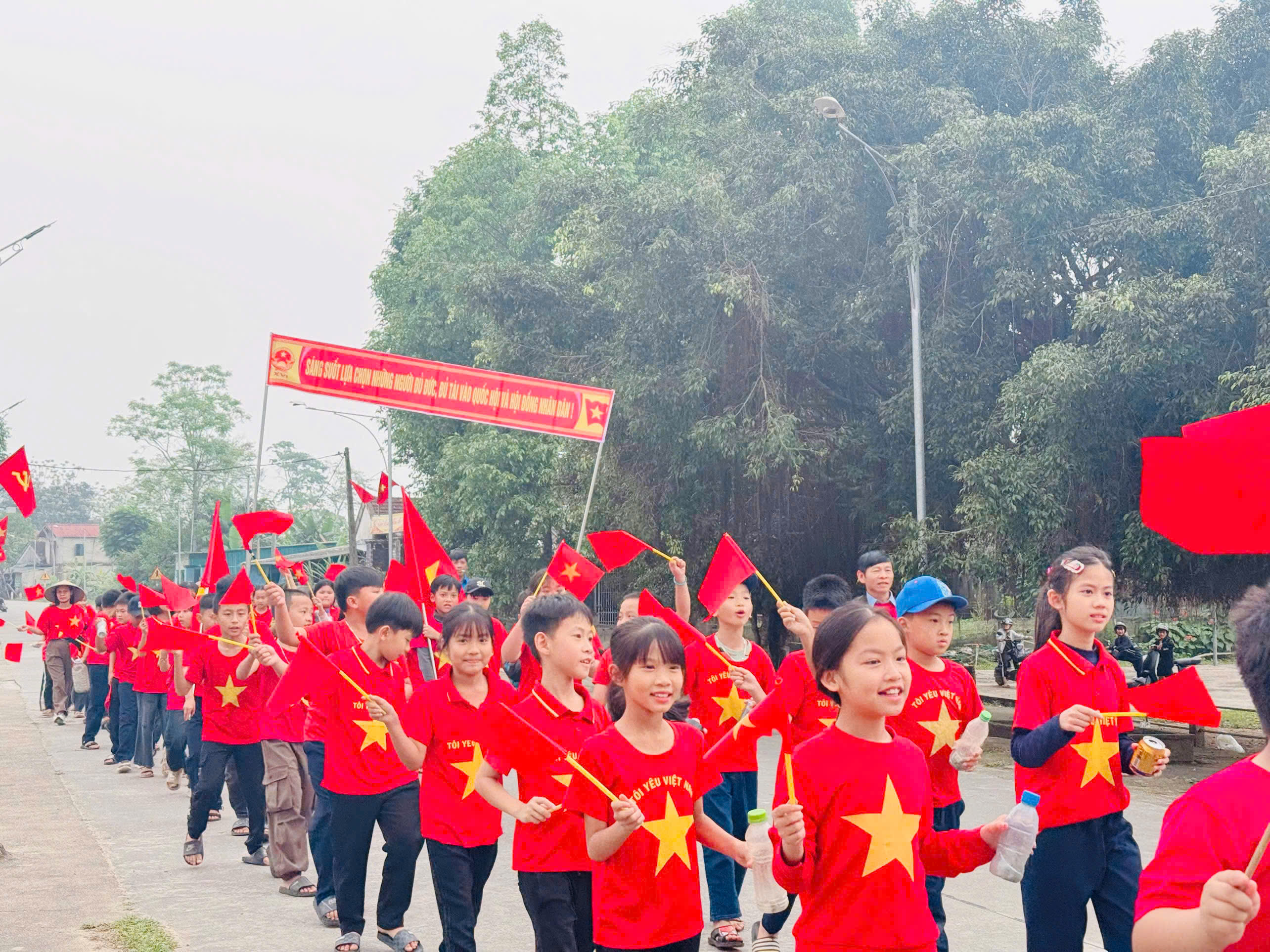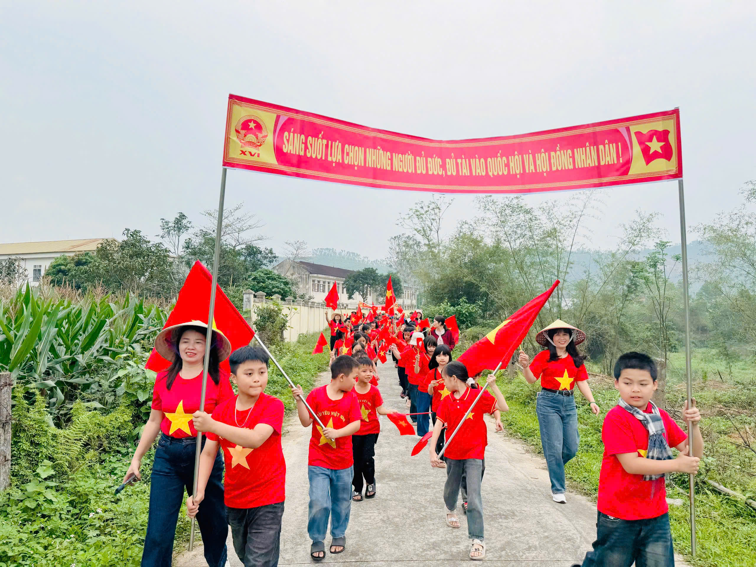 Trong tiếng hô vang rộn ràng, đoàn diễu hành đi qua nhiều tuyến đường thuộc thôn 1 và thôn 2 Văn Giang, kêu gọi cử tri tham gia bầu cử đầy đủ, đúng thời gian quy định.