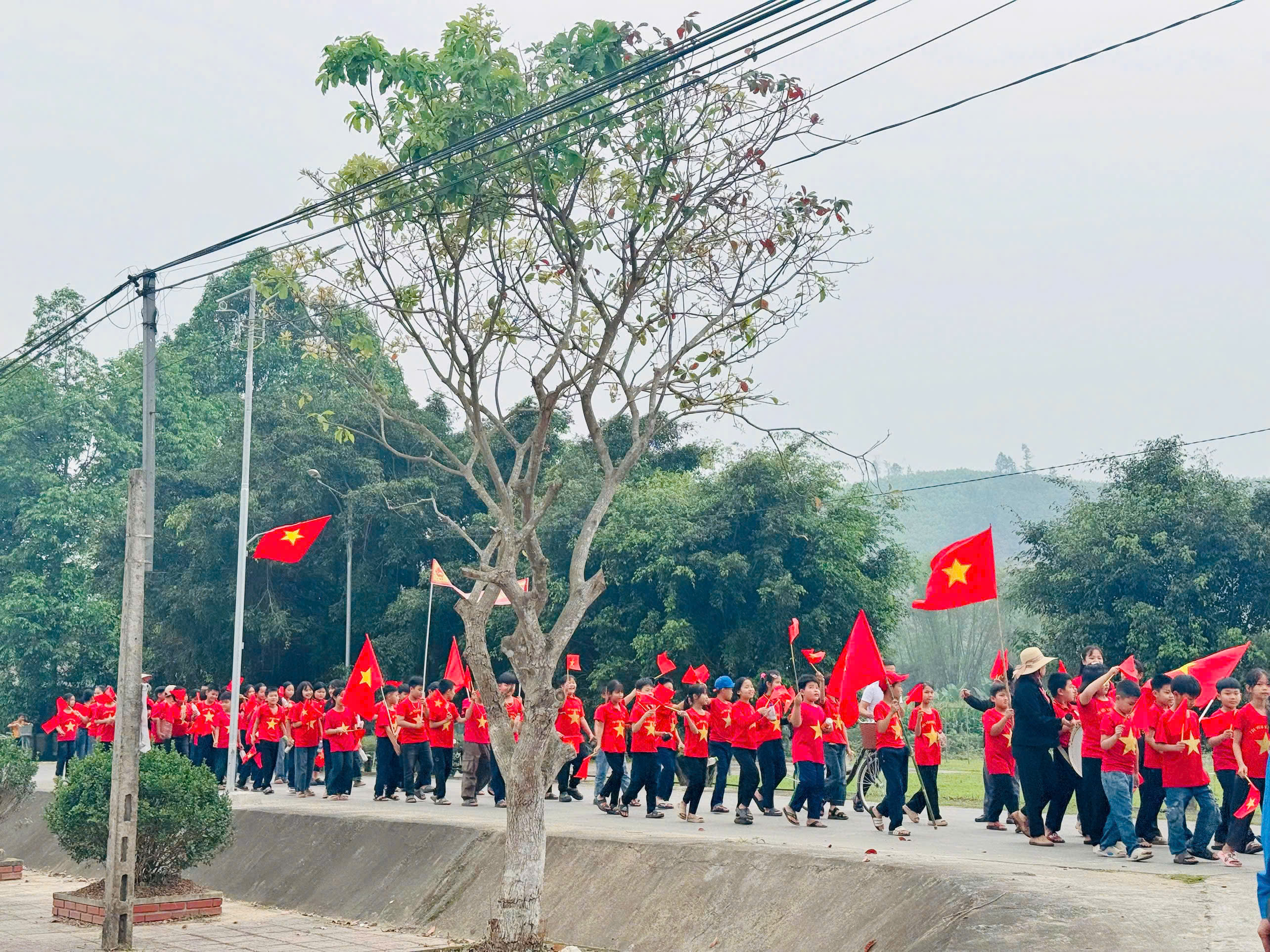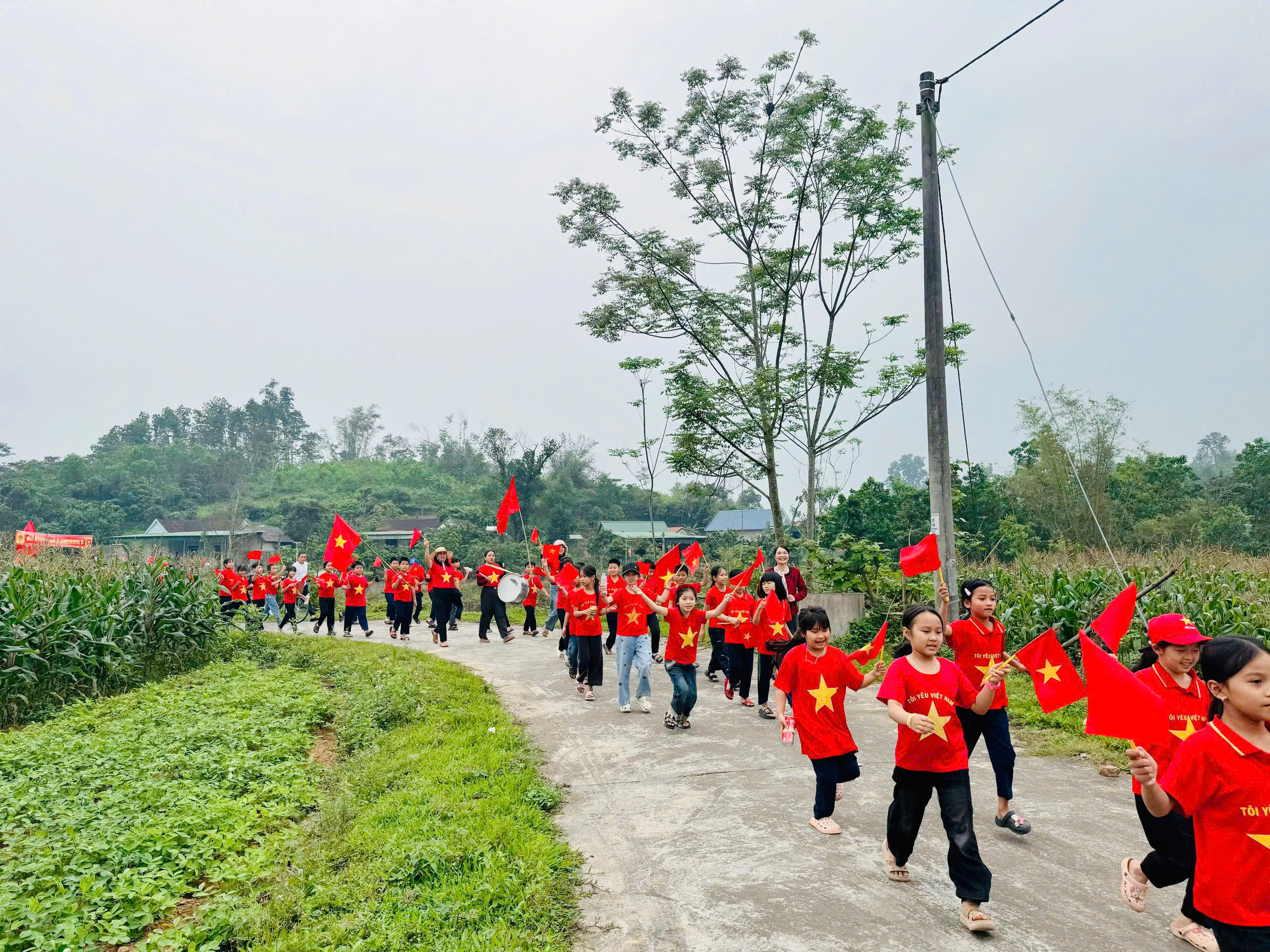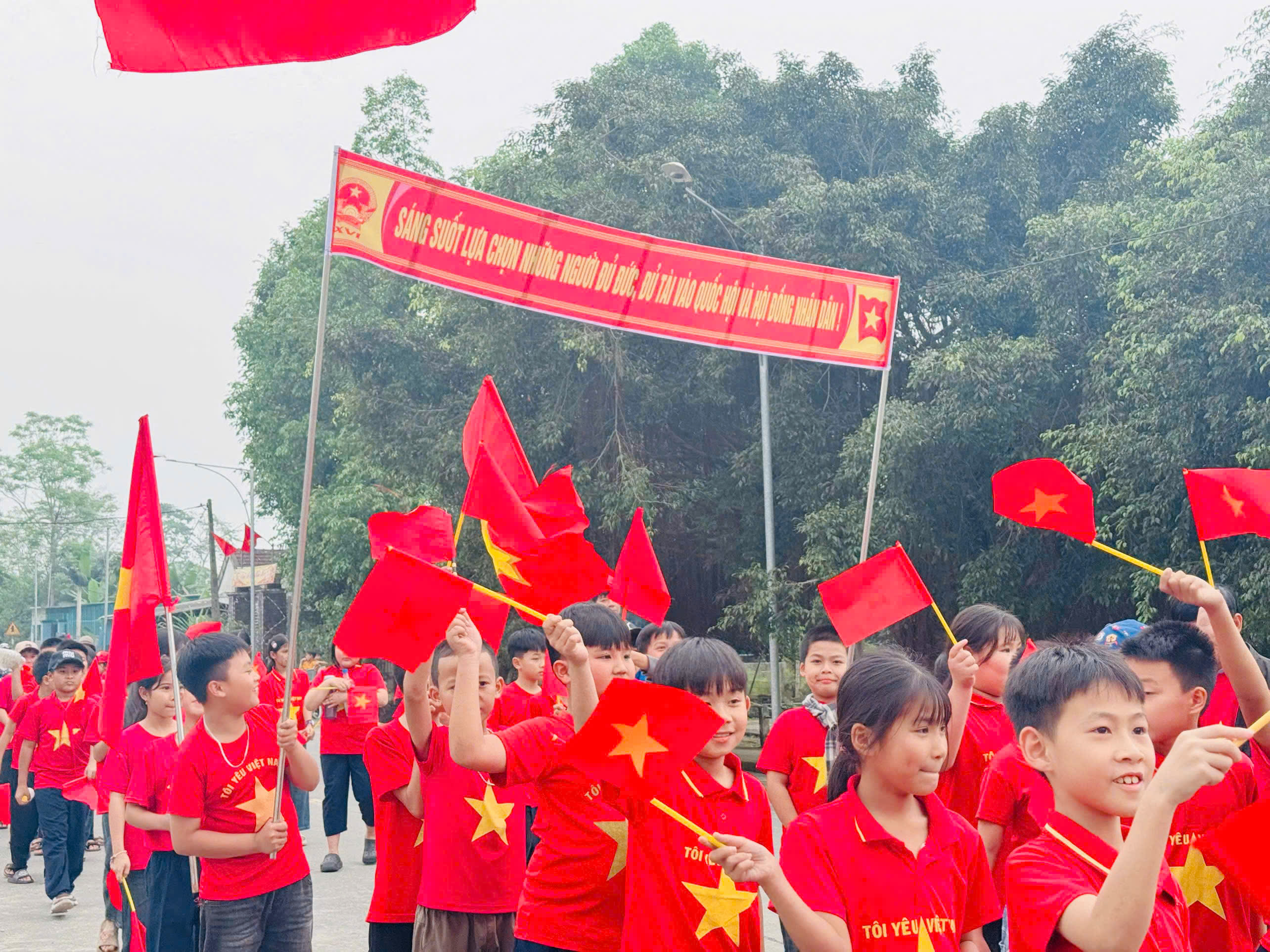Trong tiếng hô vang rộn ràng, đoàn diễu hành đi qua nhiều tuyến đường thuộc thôn 1 và thôn 2 Văn Giang, kêu gọi cử tri tham gia bầu cử đầy đủ, đúng thời gian quy định.