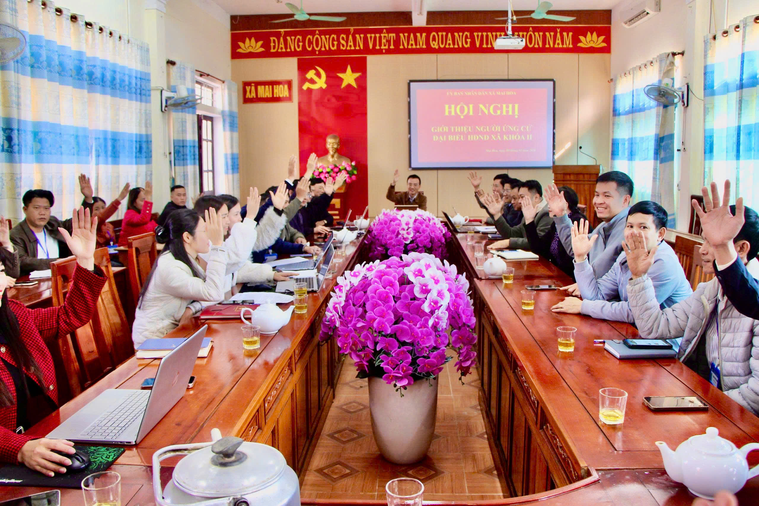 Đại biểu biểu quyết thống nhất danh sách 6 nhân sự ứng cử đại biểu HĐND xã khóa II nhiệm kỳ 2026-2030.