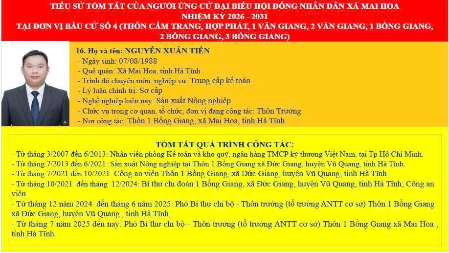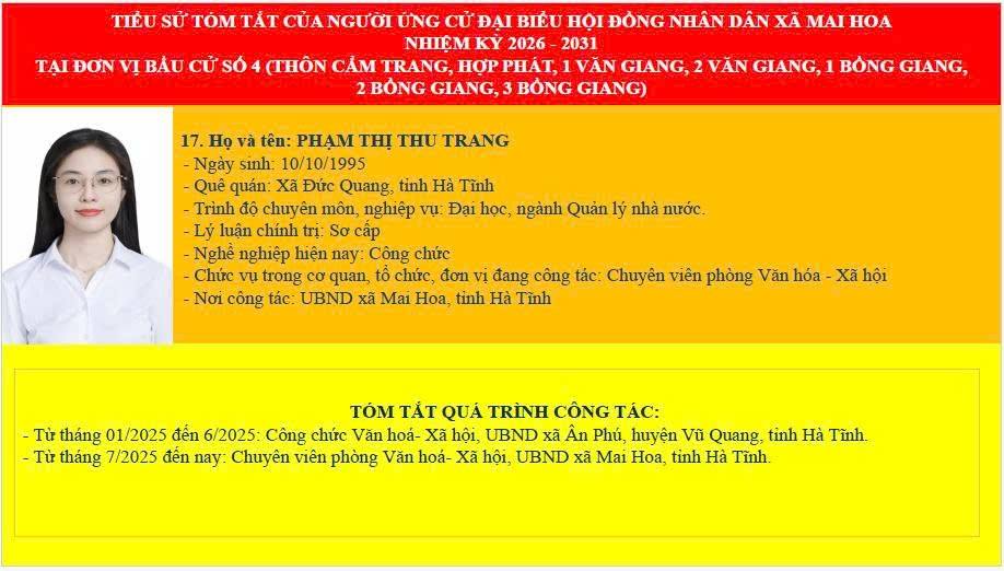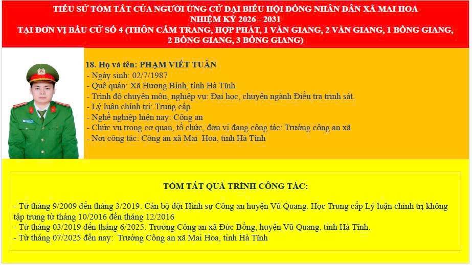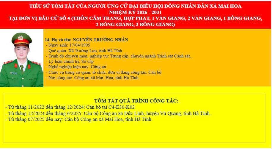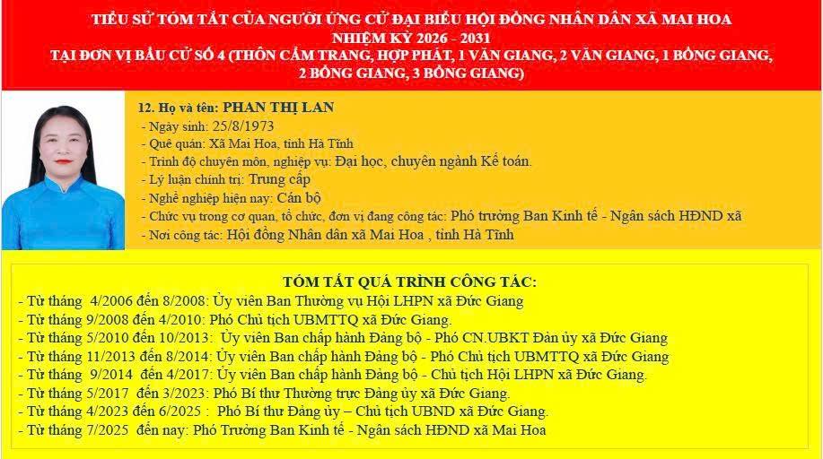 ỦY BAN BẦU CỬ XÃ MAI HOA TRÂN TRỌNG THÔNG BÁO TIỂU SỬ TÓM TẮT CÁC ỨNG CỬ VIÊN ĐẠI BIỂU HDND XÃ TẠI ĐƠN VỊ BẦU CỬ SỐ 4 ( GỒM CÁC THÔN: HỢP PHÁT, CẨM TRANG, 01-02 VĂN GIANG, 01-02-03 BỒNG GIANG)Xuân Hoàn ( Trung tâm DV-TH)09/03/2026A -A+Xuân Hoàn ( Trung tâm DV-TH)09/03/2026A -A+1. Bà: PHAN THỊ LAN 2 Ông: LÊ THANH NGHỊ 3. Ông NGUYỄN TRƯỜNG NHÂN 4. Ông: LÊ XUÂN THẮNG 5. Ông NGUYỄN XUÂN TIẾN 6 Bà: PHẠM THỊ THU TRANG 7 . Ông PHẠM VIẾT TUÂN