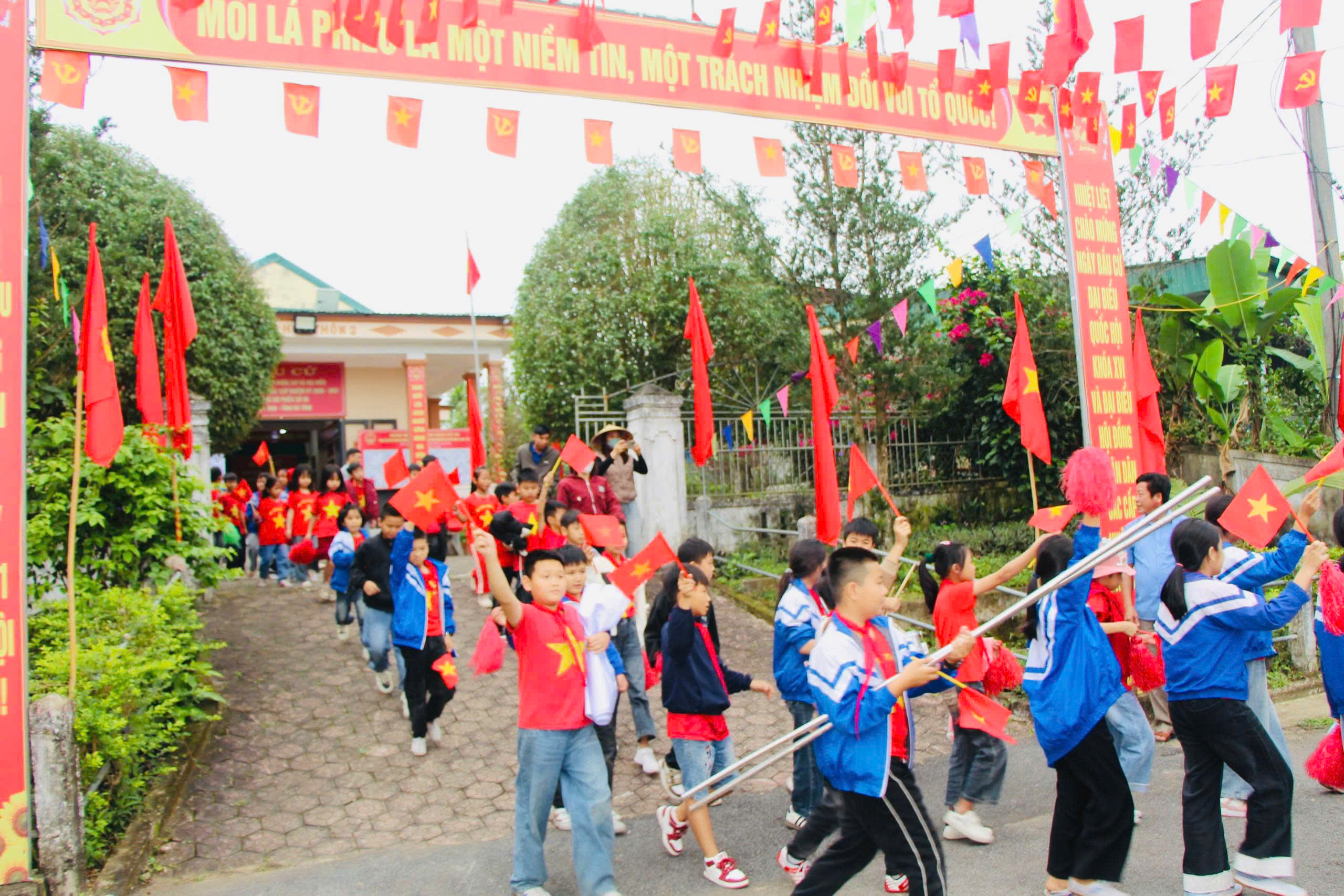 Công an xã, Đoàn thanh niên và các trường học trên địa bàn đã tổ chức các buổi cổ động, tuyên truyền lưu động trên các tuyến đường, các thôn, các khu vực bỏ phiếu với sự tham gia của trên 1.000 đoàn viên, học sinh. Hoạt động này không chỉ đơn thuần là một buổi cổ động mà còn là tiết học trải nghiệm thực tế quý giá cho học sinh. Đây là dịp để các em được tìm hiểu về quyền và nghĩa vụ của công dân góp phần giáo dục ý thức trách nhiệm đối với quê hương đất nước ngay còn nhỏ.