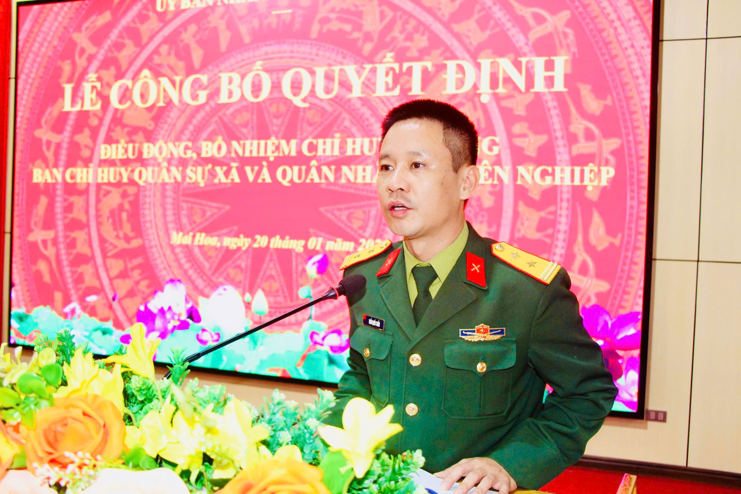 Trung tá Trần Quốc Tuấn, Chỉ huy trưởng BCHQS xã Mai Hoa phát biểu nhận nhiệm vụ