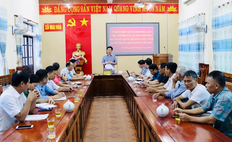 Phát biểu kết luận cuộc họp, đồng chí Phạm Ngọc Tạo – Chủ tịch UBND xã Mai Hoa khẳng định: việc triển khai mô hình “Chăn nuôi gà đẻ trứng theo hướng liên kết chuỗi giá trị” là một trong những giải pháp quan trọng nhằm đa dạng hóa sinh kế, tạo việc làm, tăng thu nhập cho người dân, góp phần thực hiện mục tiêu giảm nghèo bền vững của địa phương.